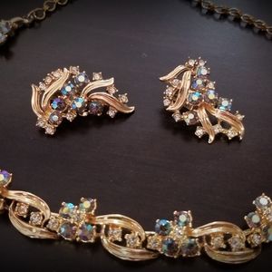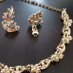 Beautiful vintage gold tone rhinestone choker and matching clip-on earrings set. No missing stones. Great condition.