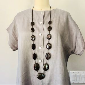 Lightweight cotton gauze with gorgeous macrame type knitting pattern around shoulder and neckline. V shaped fringe in front and back.