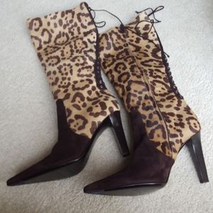 Chocolate brown suede trimmed pony hair knee high boot.