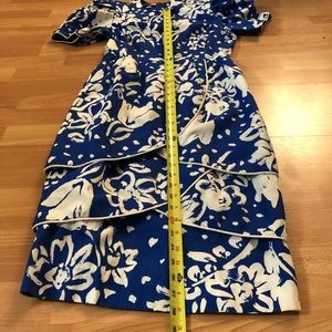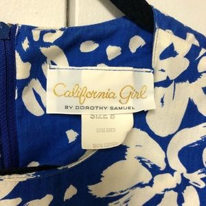 This is an amazing vintage piece: California Girl by DOROTHY SAMUEL. It has been washed and dried. This dress normally comes with a belt but I do not have it. Shoulder pads are original. Waist is elastic & has a little stretch. Scalloped, layered skirt. First pic is filtered to help show colors.