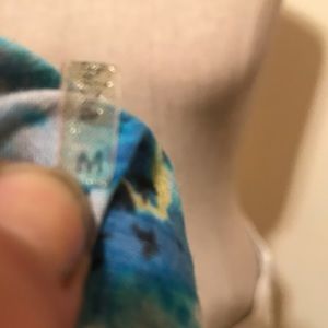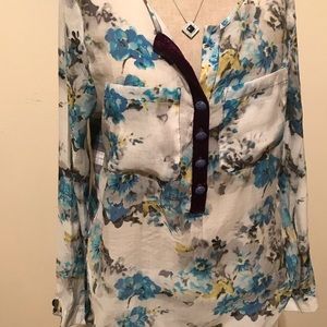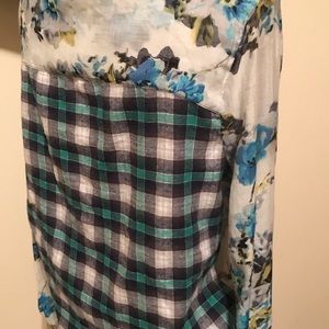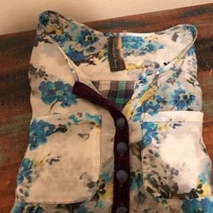 Floral blue front and plaid blue black. Such a fun lovely top to wear. Buttons are a metal blue. Velvet lining down front.