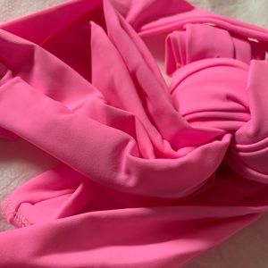 *Stunning pink lined one piece swimsuit has lots of detail with the criss cross back, the knot tie, the removable chest pads, the plunging neckline & the stretchy material