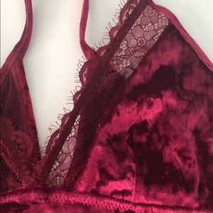 maroon velvet; super stretchy; lace trim in the front; adjustable straps; hardly worn
