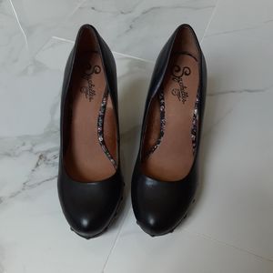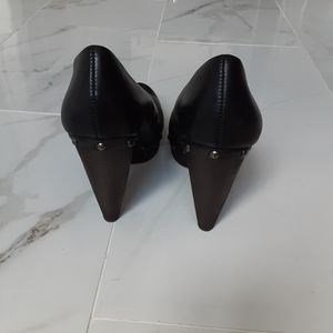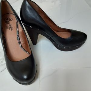 Great condition, new with box, Seychelles brand, high heels pumps, size 8.5, leather upper exterior, man made, color is black with brown wood, studded, beautiful, great for any occasion, never used, heel height 4 in., style pinup, rockabilly.