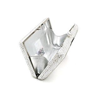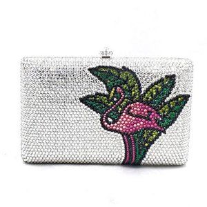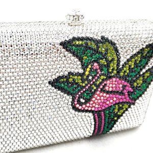 This tropical themed metal clutch evening bag is hand decorated by our artisans in a pink flamingo and palm leaves design using hundreds of Austrian crystals. It is a wonderful accessory to add to any outfit. Great for a night out on the town or a formal event. Design is repeated on the back of the purse. Includes removable chain link strap.