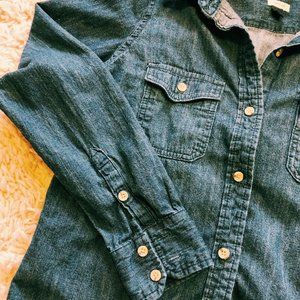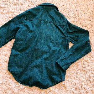 Universal Thread. Denim button-up. Size small. Dark blue. Collar. Five working buttons on front. Double button on sleeve cuff and one of actual sleeve. Working pocket on each breast. Super comfortable. Slightly fitted. In great condition.