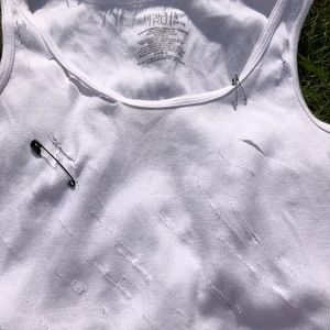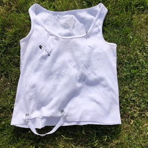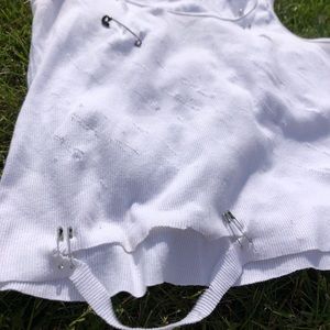 Made my hand. Ribbed tank turned into a crop top with slashes all over the front. Safety pin detailing. Could also fit a small or medium depending on desired look.