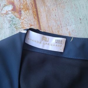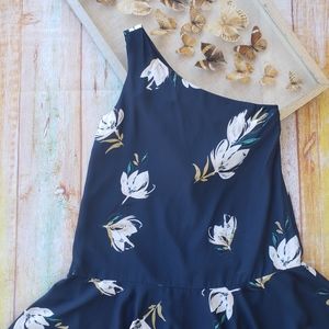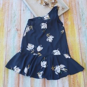 Blue foral 'Rhodes' one shoulder dress by Amanda Uprichard. Lightweight silky fabric in a flowy dropped waist style with ruffle hemline. Allover floral print. Slight irregularity in the fabric on the front near ruffle hemline but in overall good condition. Made by Amanda Uprichard, size M.