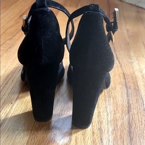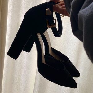 Gorgeous and sexy black velvet pumps - ankle strap with gold details. Light wear no scuffs or damage. Beautiful, unique shape and details. High end look with low cost. 3.5 heel aprox.