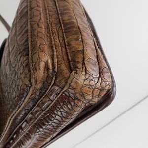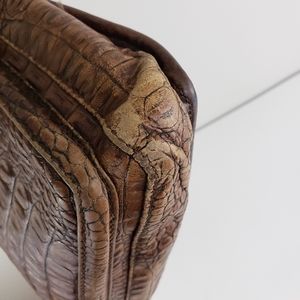 Brahmin Cognac Croc Embossed Leather Crossbody. Gorgeous crocodile skin textured medium sized cross body purse with a snap flap closure and brahmin medallion hang tang. An outer slip pocket under the snap closure and a larger inner compartment with zip pocket and pen loops. Long adjustable strap. EUC. There is some minor wear to the bottom corners as shown in pics. Lining is clean though there is a rubbed impression of the croc texture in a couple places. See pics for details.