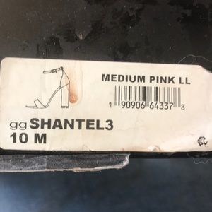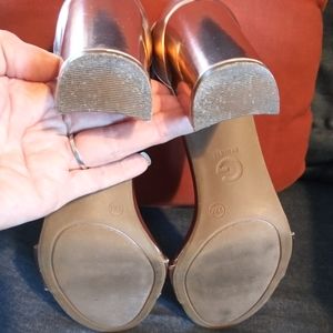 Thick stacked heels, straps over ankles. Metallic gold or as they call them, “medium pink” 🤷♀️ and fabulous. Left foot's front, small scrape, and wear on outer heel. However, with the shine of the heels, not noticable. Little 'G' charm hanging from buckle strap. Simply perfect. Price is negotiable.