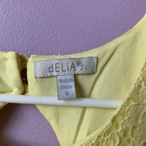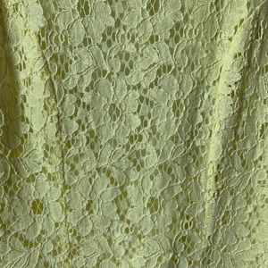 Pretty pastel yellow lace floral sundress that has a liner underneath. On the back, it has a zipper along with two buttons at the top.