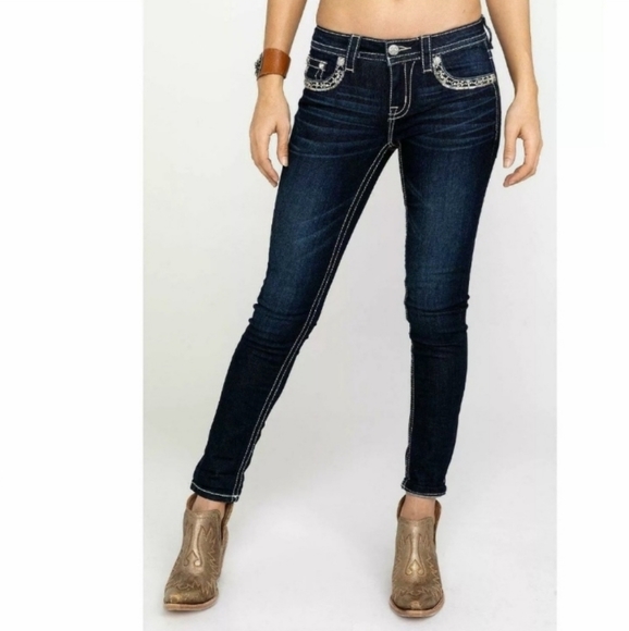 Dark wash Hailey Ankle Skinny with fading and whiskering throughout. Back pockets are embellished with metallic stitch embroidery and sequins. Detailed with large crystal rivets and silver hardware.