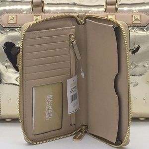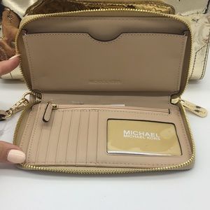 MK KARA DUFFLE SATCHEL MIRROR METALLIC SHOULDER BAG & WALLET SET Mettalic Pale Gold color Zip Top Closure Gold Tone Hardware 4 Protective Feet Custom Fabric Lining 1 Slip-in Pocket 10.5" (L) X 8"(H) X 5.5"(D) Straps: 6", 18"-22" LG Flat Phone Case Wallet Pale Gold Mirror MK Logo PVC & Leather MK Lettering Logo on front zip around closure Gold tone hardware Inside:cell phone pocket, 1 zippered/coin pocket, 1 slit pocket, 6 card slots, and 1 ID window inside 7(L) x 4(H) x 1(D)"; 7" wristlet drop