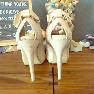 Worn size 10 super cute heels. They are platform and peeptoe in a nude color. The fabric is linen and the bow detail on the back is leather or feaux leather (I think it’s feaux but I am not sure). They have wear marks on the bottoms and can use some care with stain removal but are otherwise super cute and sexy.