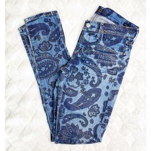 These paisley skinny jeans feature 5-pocket styling and a single-button closure. Stretch denim. 98% cotton/2% elastane.