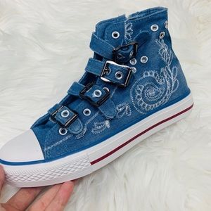 Brand new high tops with denim material and a unique embroidered paisley pattern and decorative buckles. Zips up the side.