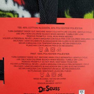 This is a Dr. Seuss Grinch Who Stole Christmas themed pajama top and bottom gift set. NWT. Available in men's small. Contains short sleeve top and pants. Top says "I'll be Good Next Year". Top is 60% cotton, 40% polyester. Bottom 100% polyester. Machine washable.