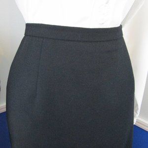 Classic style vintage black career skirt, flattering fit, fully lined, hidden side zipper w/button, 6" back kick vent. Beautiful worsted wool material. One tiny hole repair near front hem, cannot be seen when worn (photo). No other flaws, in very good rarely used condition. Size tag missing.