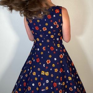 Such a stunning piece! 80s does 60s in this beautiful bright floral print midi dress. Feautures big round navy buttons up the front and pockets. Suky Rosan