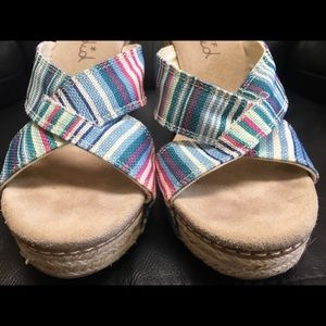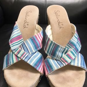 Splendid 5 inch wedge with a 1 1/4 platform. Cute summer striped sandal with a soft plush footbed. The stripes are hot pink, ivory, light blue, light free, teal colors. Only worn a few times, but you can see the indent of my toes at the top of the shoe because of the soft footbed. I really love these wedges with a fun summer outfit.