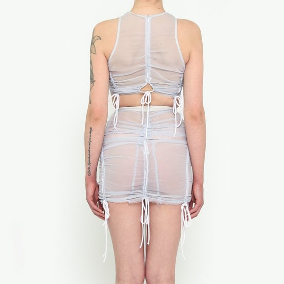 Custom made sheer lilac top with adjustable drawstrings, ruched detailing, raw cut hemline, raw edges, distressed finish, zipper closures.