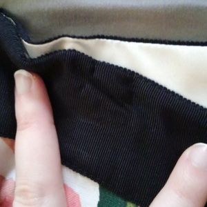 Watercolor flower pattern. Modi skirt. Box skirt style with large pleats. Satin interior. Does not stretch. Black band at top of skirt. Never worn but no tags. Machine wash cold and hang dry. Great with a black top for a fancy event or wedding. On band marks from hanger hanging it in my closet.