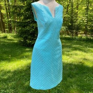 Worthington sleeveless dress. Pastel blue-green fabric with textured weave pattern. Smooth lining, 6” slit in back. Machine washable. In excellent condition- area of wear to the interior lining is shown in last photo. Otherwise no rips, tears, stains & comes from smoke free home.
