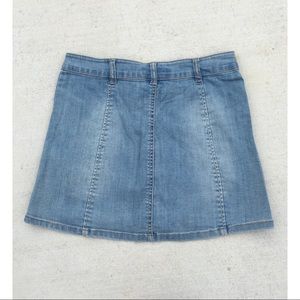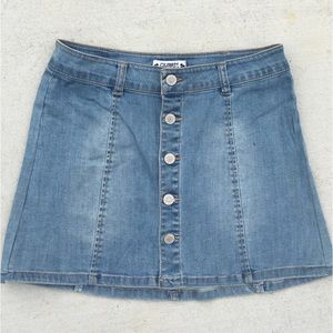 Faded denim paneled a-line skirt with silver buttons. Girls 14, will fit size 2-4.
