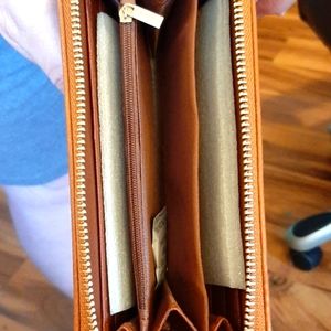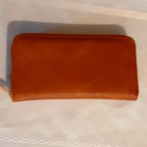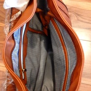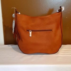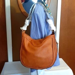 Beautiful cognac shoulder bag with braid accent. Gold colored hardware and one zippered pocket on the back. Striped lining with one interior zip pocket and two slip pockets. Zipper closure.