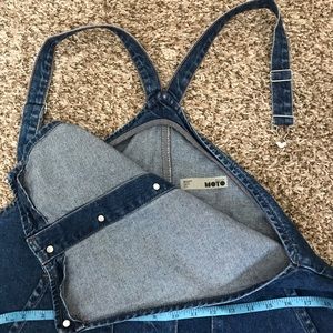 TopShop denim overalls dress. Adjusting straps. Front buttoning. Medium/dark wash denim. Size 10