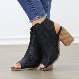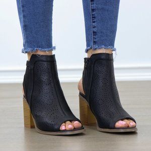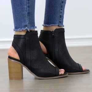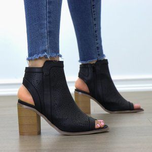 Black Laser cut Design Open Toe Ankle Boots