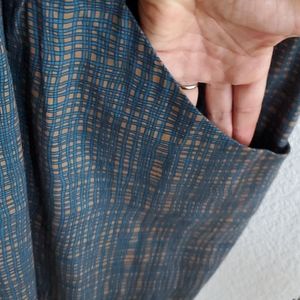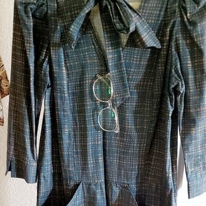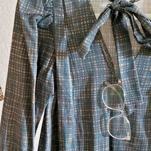 The blue dress has a cute bow detail on the V neckline. It has front pockets. Slight puffed up 3/4 sleeves.