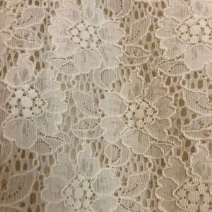 White form-fitted dress w/ lace overlay. Silver embellishments around neckline. Never worn with tags.