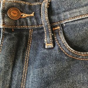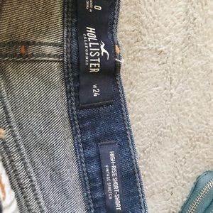 Dark wash, denim, frayed edges, “high-rise short short,” gold stitching, size 0 w24. My favorite pair of shorts; very reliable and a necessity.