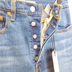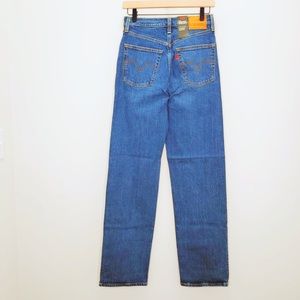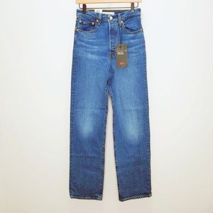 A true blue jean in a five-pocket styling with a high-rise, straight-leg fit. Button fly closures. Features the iconic leather patch, a symbol of quality and style for generations.