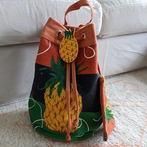 I mean, look at this thing! Canvas bodied bag with AMAZING large pineapple print and a hand-painted, wooden pineapple over a draw-string closure. The bag includes a mini-pineapple bag inside to keep essentials (wallet, phone, keys, etc.) handy. The bag has a single, adjustable over the shoulder strap and a easy grab-and-go handle. The canvas bag is treated with a waterproof coating on the inside, making it prefect for a day at the beach. Easily fits two beach towels, water bottle, book, + more.