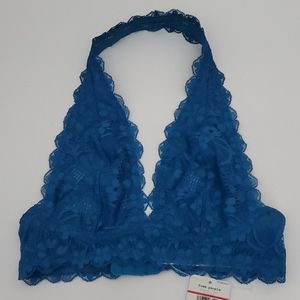 Soft floral lace bra features a sporty halter strap and enough stretch for a close, comfortable fit.