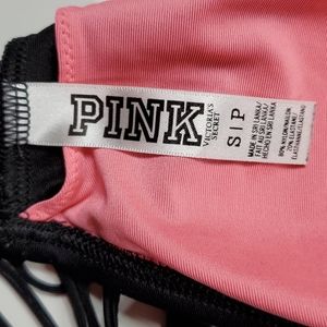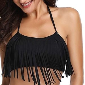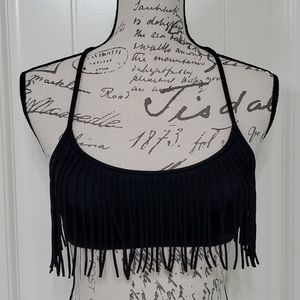 This Victoria's Secret PINK black fringe halter bikini top is SOOO CUTE! Fringe goes all the way around. Ties around neck & features slight padding that is removable. Pink & black inside. EUC!