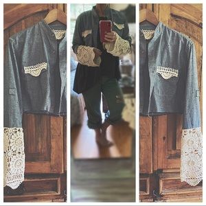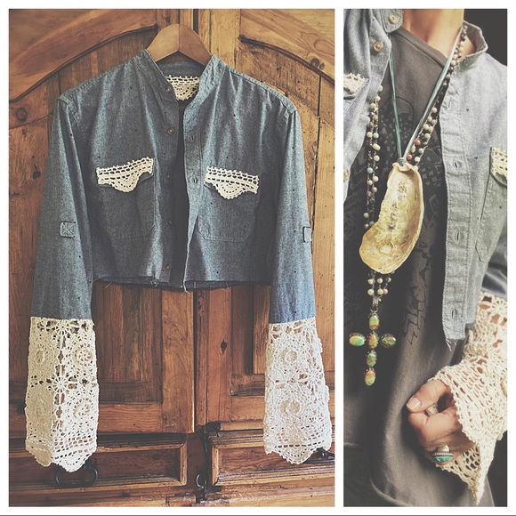 Mandarin collar Chambray shirt with tiny navy blue triangle detail vintage ivory cotton macrame bell sleeve, and detail on pockets . Raw unfinished hemline on jacket Large oyster shell statement piece necklace with vintage green leather free with purchase .cross not for sale