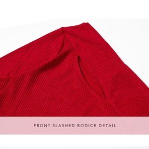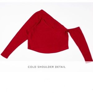 Our Cherry On Top Sweater features an asymmetrical neckline with a cold shoulder detail and front slashed bodice detail. Designer note: Goes with everything from your boyfriend denim to your leather skirt.