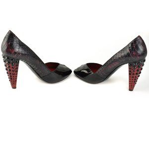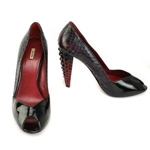 Black, patent leather peep-toe heels/pumps with "python" leather panel accented by red, composite heel inlaid with black rhinestones