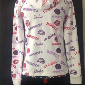 On Fire Bonita Mamacita Chula Sweater Size S, Lips, Hooded Sweater - New with tags (NWT) - White background - All-over bright print - Hood - Drawstrings - Super soft & cozy lining Excellent New Tags: Chula Latina, Bonita sweater, cozy sweater,