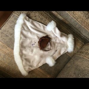 Comes with lace top, faux suede skirt, faux fur hat & coat, heeled boots, dangling necklace, & purse with accessories as shown