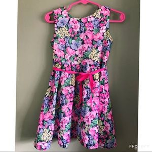 Purchased at Carters, this cute little dress comes complete with a little white slip underneath. Worn only one time by my daughter to a baby shower for a couple of hours! No rips or stains. Zipper back, also has a pink waist bow tie. 🌸