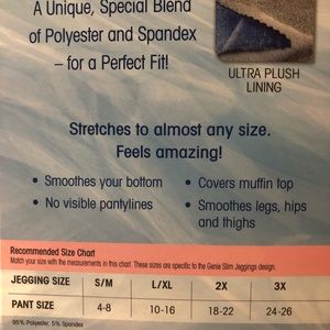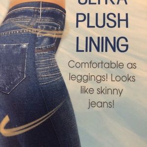 They are as comfortable as leggings, but they look like skinny jeans. They have pockets like real jeans. They have ultra plush lining providing comfort all women wish for. No more pulling, squeezing, or sucking it in Just relax and slip in! They smooth your bottom, legs, hips and thighs! They have a unique, special blend of polyester and spandex for a perfect fit. They stretch to almost any size. Bran new in unopened box. Excellent Condition. Offers Welcome