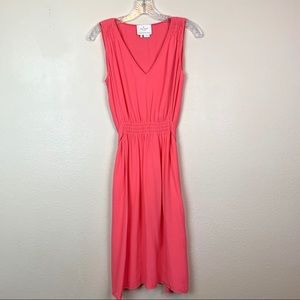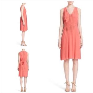 ⦁ Features: watermelon color, tie back crepe dress. V neck.