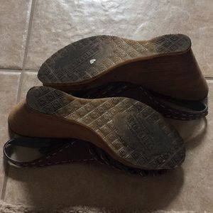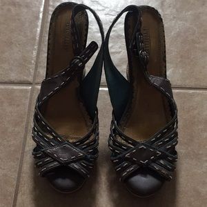 Love the dark brown with creek stitching and the gold sole with light blue lining color & the cork wedge material!