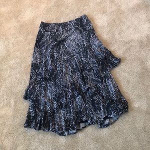Blue snake pattern ruffled skirt by Free People. This skirt sits high waisted and comes to mid calf length. I am 5”7