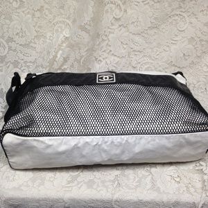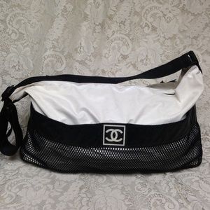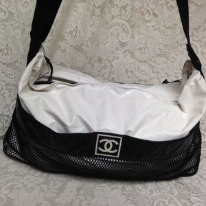This is a beautiful , large weekender or beach bag made of white and black nylon material. It measures 20 inches long, 10 inches high and 8 inches wide and comes with a 44-inch adjustable strap. It is distressed condition and has soiling, discoloration, spots, scuffs, etc as shown in photos. It is marked Chanel with Serial No. 8308382.